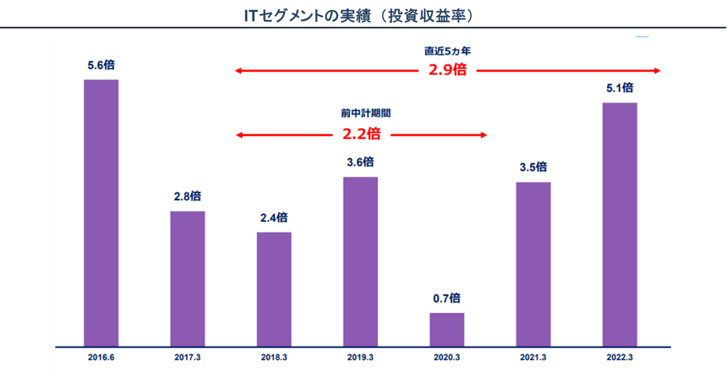 ITセグメントはアーリーステージのスタートアップ投資に強みを有している 。この分野でDGは成功を収めており、過去5年間の平均投資収益率は2.9倍となっている。一方で、DGはこの成功を活かし切れていない。