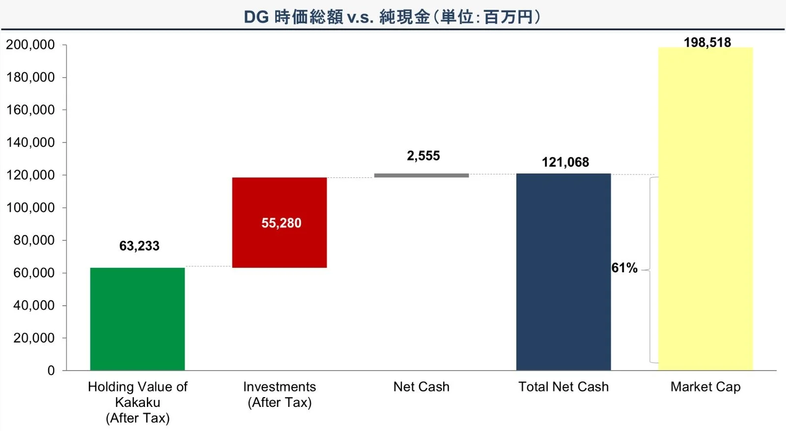 DGの有価証券を含む純現金は時価総額の61%に達している。一方で、株主としては保有資産が還元されるのか疑義があり、保有資産の価値はDGの株価に織り込まれていない。