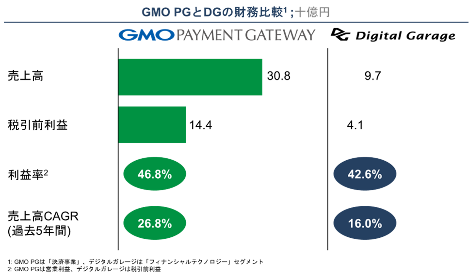 DGとGMO PGのバリュエーションの差は大きく、GMO PGはDGの2.8倍の倍率で取引されている。